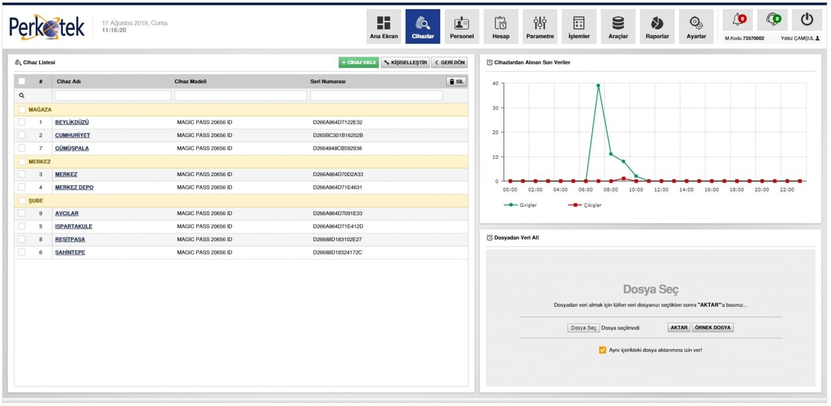 - Dashboard üzerinde bulunan anlık giriş çıkışlar sayesinde canlı ekran üzerinde işlemlerinizi yaparken hangi cihazdan hangi personelin giriş veya çıkış yaptığını rapor almadan görebilmeniz mümkündür.