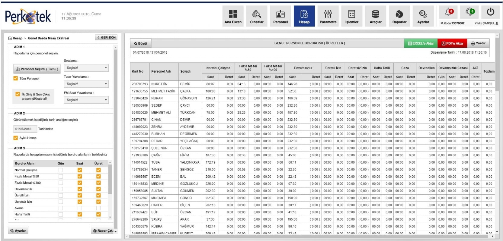 - Puantaj raporunu büyütebilir Excel, PDF olarak dışarı alabilir veya yazdırabilirsiniz.